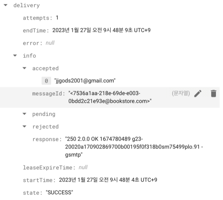 전송이 성공했을 경우의 메세지. Delivery State 가 Success로 되어 있다.